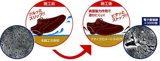 ソグナップは、今まで滑りの主な原因であった水分を、逆に利用して滑りを止める防滑改修技術です。